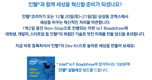 • 자세한 문의 사항은 Intel IoT Roadshow 행사 사무국으로 문의 주시기 바랍니다.